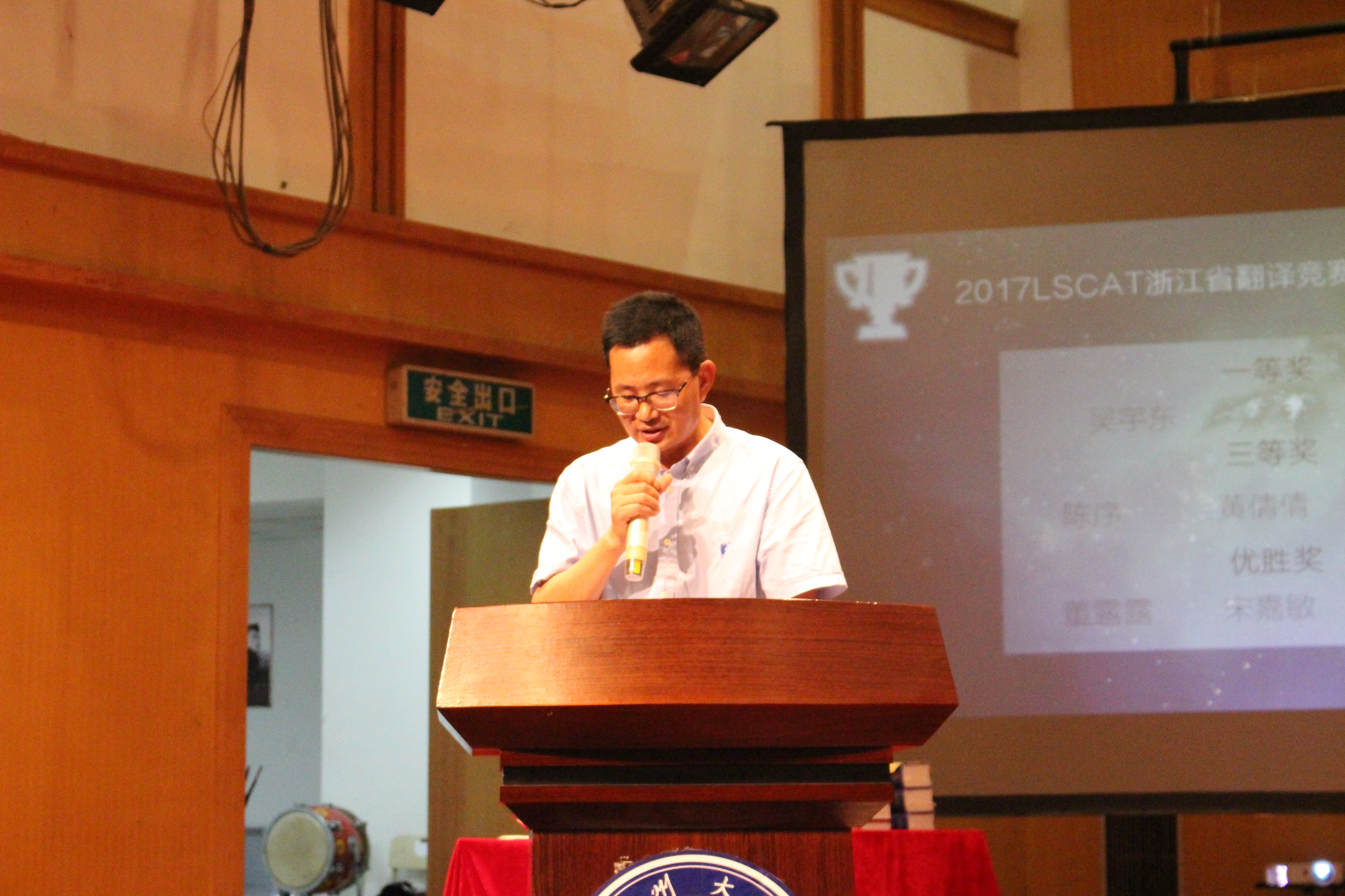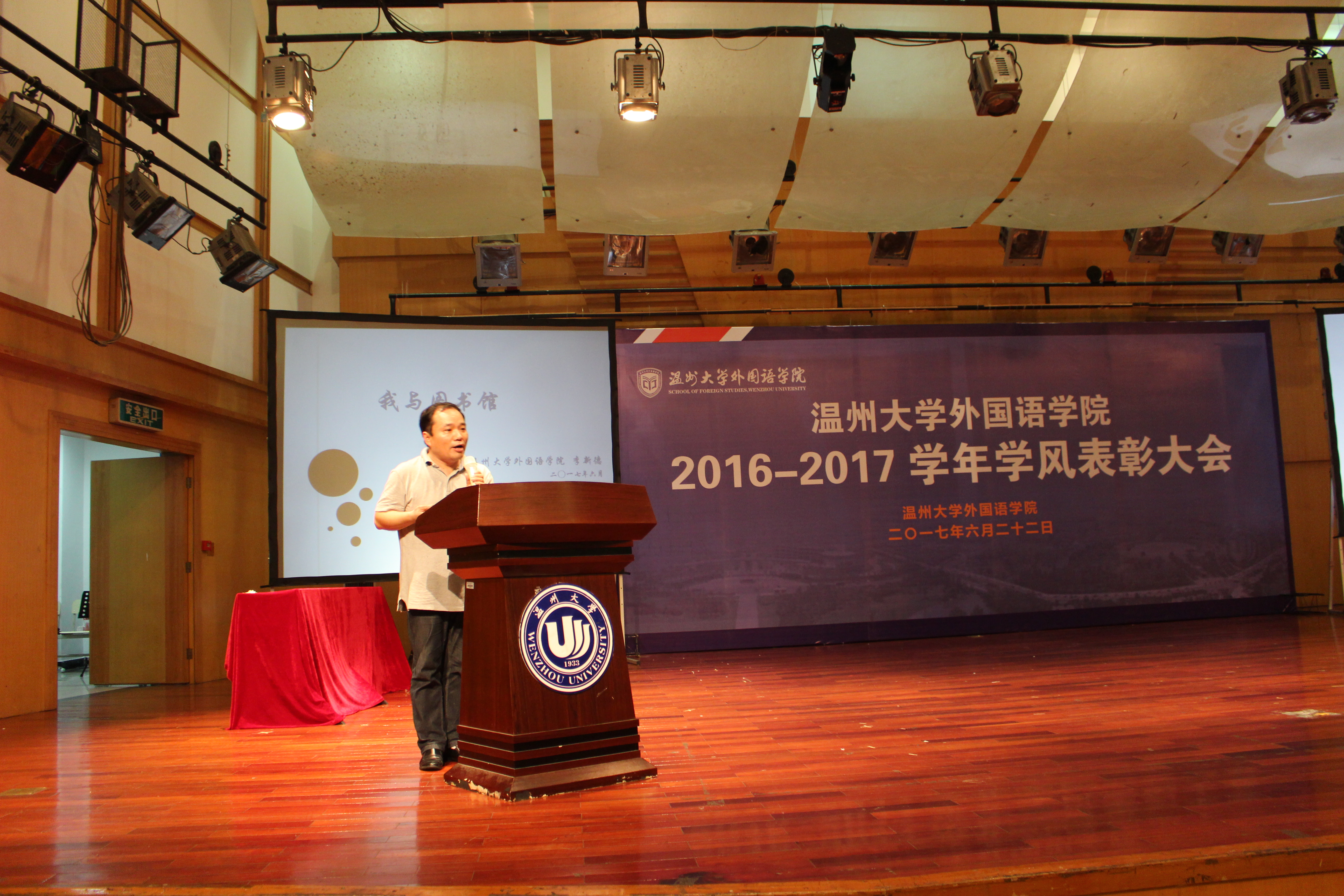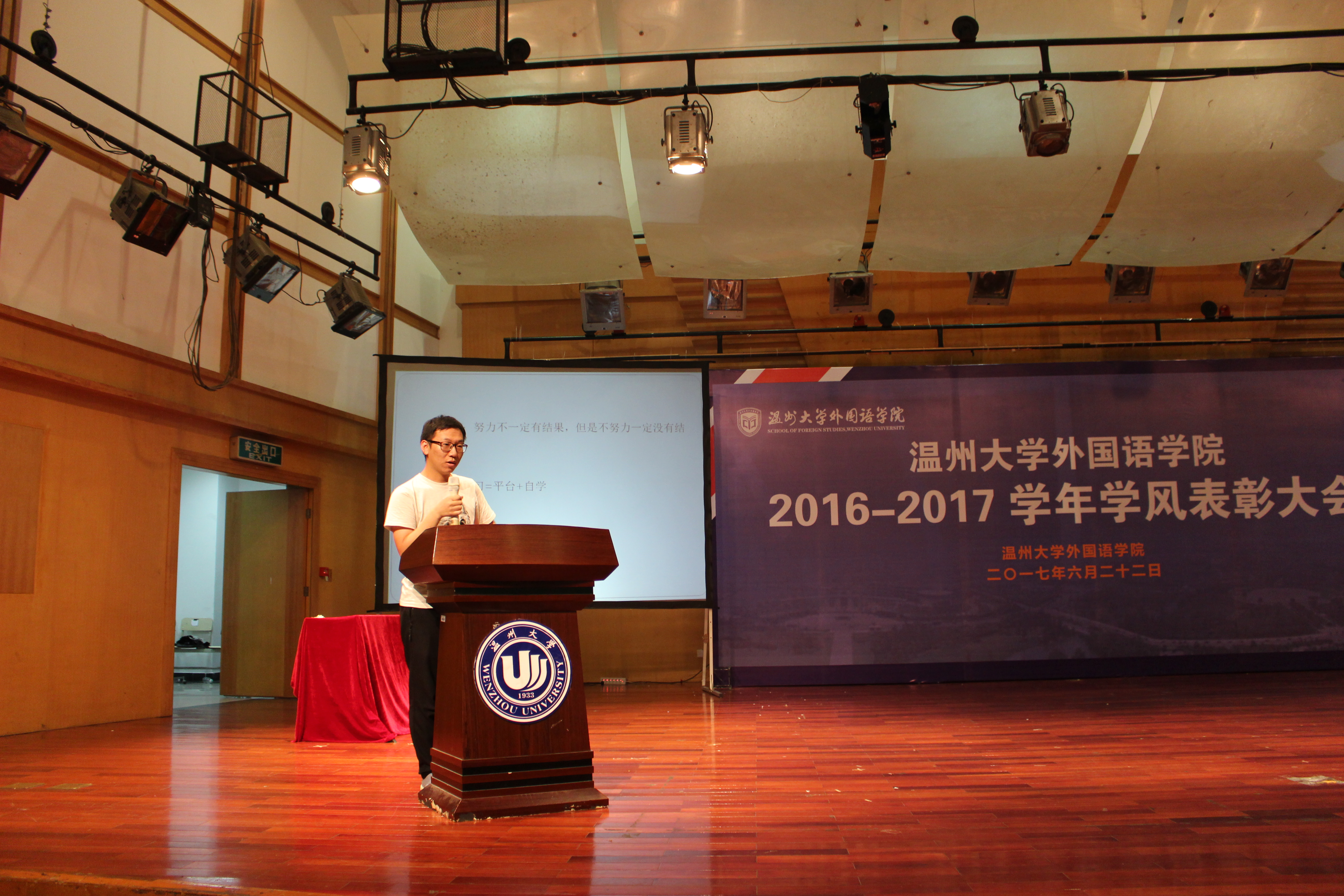 晚上6:00,本次表彰大会正式开始。首先,由16级翻译班的同学献上一首热情洋溢的歌曲,点燃现场的气氛。接着,毛院长上台致辞。他以四个"A"总结了这一年来必赢76net线路同学的学习所得并表达了对同学们的美好祝愿,希望同学们能够在未来取得更大的进步。随后,陈孟森书记公布2016-2017年国家奖学金、省政府奖学金等十六项奖项获奖人员名单,获奖人员依次上台领奖,全场气氛活跃,掌声此起彼伏。各项奖项颁奖结束后,李新德老师上台分享自己过去二十年的阅读心得。他提到学习既要注重课堂学习,更要注重在图书馆的自我学习。李新徳老师以自己多年来的亲身经历教导同学们必须养成常驻图书馆、常阅书籍的好习惯。此外,他还强调了在阅读过程中培养批判性思维能力的重要性。金力学长以努力这一关键词切入,指出了平台与自我学习之间相辅相成的内在关系,并与同学们分享了丰富的学习资源及如何取得专八优秀成绩的经验。最后,留学美国的14届学生洪果分享了在国外留学的经历。她主要介绍了在美国的业余生活、课内学习方式。通过在美国的学习体验,她提到有效的课外学习与课堂参与度有助于提高获取知识、提高能力。她亲切幽默的态度、充实有趣的讲话内容引得同学们笑声连连、掌声阵阵。