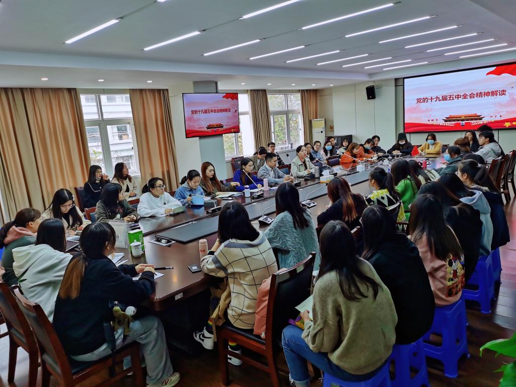 十九届五中全会审议通过了《中共中央关于制定国民经济和社会发展第十四个五年规划和二〇三五年远景目标的建议》(以下简称《建议》),描绘了我国进入新发展阶段的发展蓝图。《建议》体现了“高、早、广”三个特点,“高”代表着党中央的高度重视;“早”意味着早思考早部署;“广”则象征着广泛征求党内外意见,集中全党智慧,充分体现民意。《建议》的起草工作真正做到了发扬民主、开门问策、集思广益,是科学决策、民主决策、依法决策的典范。姜海燕书记还分别从新发展成就、新发展形势、新发展阶段、新发展目标、新发展指南、新发展格局、新发展任务以及新发展保证八个方面进行阐述,深入分析和研究了《建议》的主要精神。最后,姜海燕书记谈到,要深入学习领会习近平总书记重要讲话内涵要义,将全会精神的丰富内涵贯彻到工作的方方面面,特别是要把全会精神融汇和迁移到学院发展的工作中去,牢牢把握新形势、新要求,结合学院发展“三大目标”开展工作,在总结梳理“十三五”期间学院发展的经验和不足的基础上,凝心聚力,守正创新,努力实现在“十四五”期间办学特色、学科实力、办学水平、社会声誉等方面的显著提高。