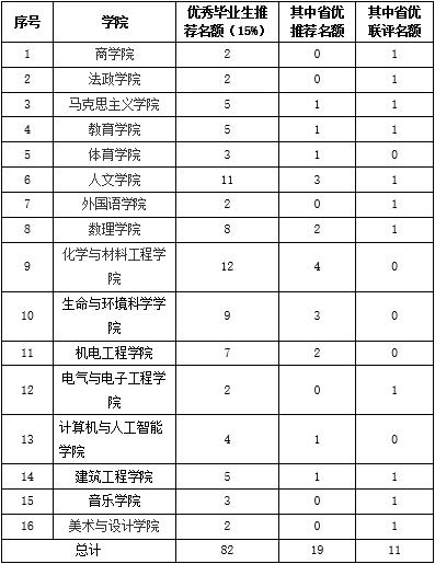 根据相关文件精神,研究生校级优秀毕业生人数不超过当年应届毕业研究生总数的15%(前5%推荐为研究生省级优秀毕业生)。根据毕业生就业系统名单测算,拟评选27名研究生省优毕业生,其中19个指标以“推荐名额”按比例直接分配到学院,8个指标在11个学院的推荐人选中通过联评产生(经联评未被推荐为省优毕业生的3人为校优毕业生)。拟评选校优秀毕业生55人,具体指标分配见下表。