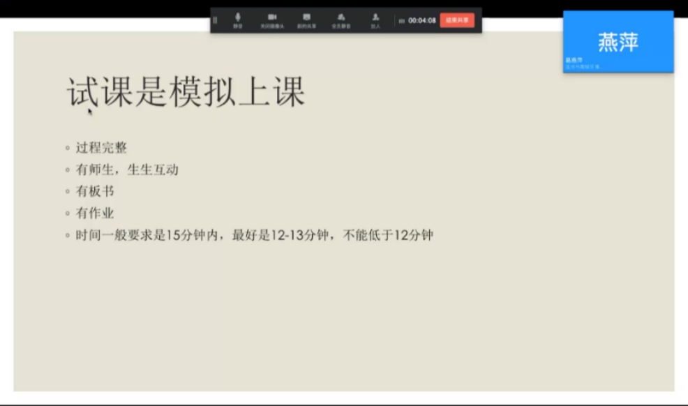 Part1:邹丽娟老师讲解试课(模拟上课)的基本要求: