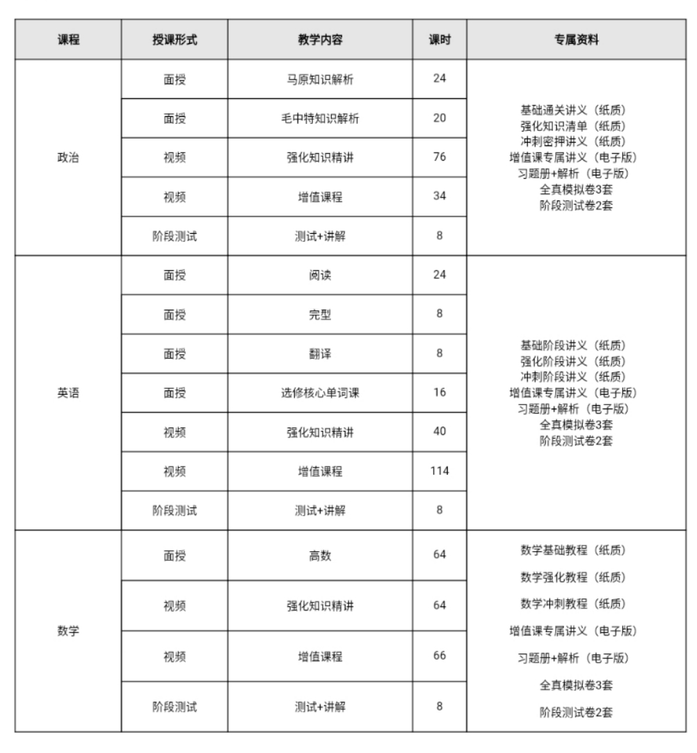 暑期课程培训采用现场授课的教学形式,授课课程包括政治、英语、数学(详见附件1)。